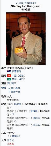 何鴻燊[a],大紫荊勳賢,GBS,OBE ,CStJ,SPMP,SPMT,GML,GLM(英語:Stanley Ho Hung-sun,1921年11月25日-),生於香港,港澳商人,澳門博彩專利權開放之前經營澳門娛樂賭博公司,在澳門博彩業獨佔鰲頭,有「賭王」之稱,而且其名下的香港信德集團業務深入航運、地產、酒店及娛樂等多個行業。