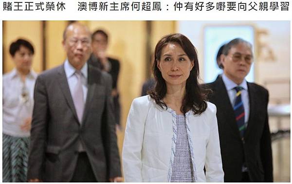 至於接班的何超鳳,是何鴻燊與二房太太藍瓊瓔的次女,在何鴻燊11位女兒中排行第5。在此之前,何超鳳談到即將接任澳博主席時說:「壓力一定會有,因為這個是重任。」