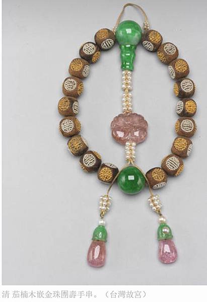 清 茄楠木嵌金珠團壽手串。(台灣故宮)