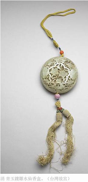 清 青玉鏤雕水仙香盒。(台灣故宮)