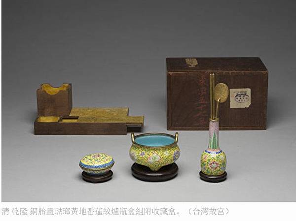 清 乾隆 銅胎畫琺瑯黃地番蓮紋爐瓶盒組附收藏盒。(台灣故宮)