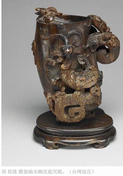 清 乾隆 雕伽楠木螭虎龍尾觥。(台灣故宮)