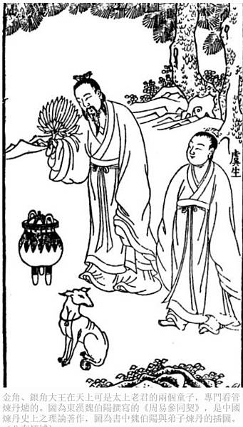 金角、銀角大王在天上可是太上老君的兩個童子,專門看管煉丹爐的。圖為東漢魏伯陽撰寫的《周易參同契》,是中國煉丹史上之理論著作,圖為書中魏伯陽與弟子煉丹的插圖。(公有領域)