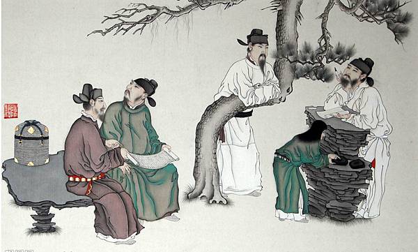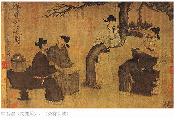 宋徽宗“瘦金體”題字:“韓滉文苑圖,丁亥御札”,下書“天下一人”押,遂定為唐代韓滉作。然從時代風格看,少唐畫氣息,最明顯的是衣紋線條顫動曲折,極似五代周文矩所創的“戰筆描”。另外人物頭戴的“工腳上翹”的襆頭形式,亦至五代才出現。同時,美國大都會博物館藏有一本周文矩的《琉璃堂人物圖》卷,後半段畫面與此圖完全一樣,故可肯定《文苑圖》作者是周文矩,所畫內容為琉璃堂人物故事。至於兩圖孰為原本?抑或均屬摹本?據考,美國的《琉璃堂人物圖》卷水平較差,人物面相稍欠神采,衣紋用筆頗見柔弱,且圖首宋徽宗題“周文矩琉璃堂人物圖,神品上妙也”和下鈐“ 內府圖書之印”均偽,故此圖當為宋以後摹本。而《文苑圖》人物神采奕奕,筆墨功力深厚,本幅右下角又有南唐墨鈐“集賢院禦畫印”,證明此圖不會晚於五代,極可能即周文矩原跡,惟前半段已佚,也許周文矩又重臨了後半段,亦不排除為同時高手臨仿本。總之《文苑圖》屬五代真跡名品,殊無疑義。作品所繪琉璃堂人物故事,據考即唐玄宗時著名詩人王昌齡任江寧縣丞期間,在縣衙旁琉璃堂與朋友宴集的故實,與會者可能有其詩友岑參兄弟、劉眘虛等人。《文苑圖》繪四位文士圍繞松樹思索詩句,有倚壘石持筆覓句者,有靠松幹構思者,有兩人並坐展卷推敲改詩者,情態各異,形神俱備。所缺前半段從《琉璃堂人物圖》中可以看到,是畫四人圍坐議論,其中有一位僧人,還有侍奉的僮僕。從全卷場面可領略當時宴集之盛況。此圖畫法與《琉璃堂人物圖》及周文矩另一幅《重屏會棋圈》卷(宋摹本)相比較,風格相似,都呈周氏典型面貌,但水平卻有高下之分。本圖人物衣紋所運“戰筆描”細勁有力,曲折中見流暢,圓潤中具輕重,樹石勾染細緻,富層次和立面感,人物情態尤富神采,個性各異。作為五代一幅真跡,確反映了該時代所達到的水平。此圖見於《石渠寶笈·初編》和明·詹景鳳《玄覽編》著錄,可能曾入南唐後主李煜《閣中集》,後又入北宋徽宗《宣和睿覽集》。