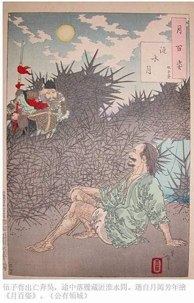 伍子胥出亡奔吳,途中落難藏匿淮水間。選自月岡芳年繪《月百姿》。(公有領域)