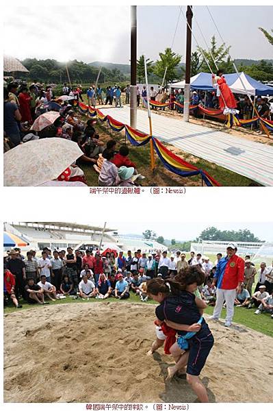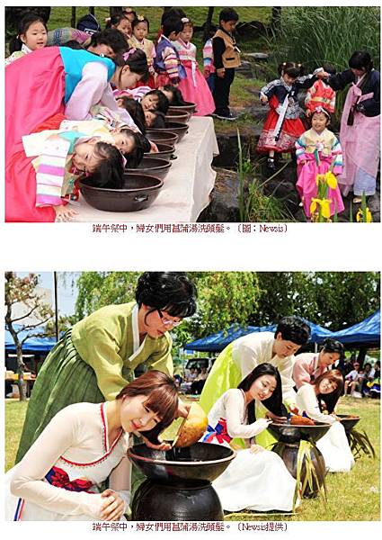 第三段:韓國方面,根據記載馬韓習俗的魏志韓傳,播種後的五月會有群眾聚在一起祭神、不分晝夜享受飲酒和歌舞,因此有人推測說祈願農耕豐收的五月祭應該就是(韓國)端午節日的前身。(...略)女子在端五日會用燒煮菖浦的水洗髮,會穿紅色或青色新衣,將菖浦根染紅做為髮釵用。男子會在腰邊插著菖浦根是為了除厄。(以下艾草功效略)有端五日午時洗澡不生病之說,因此有端午潑水的活動和埋身於沙的習俗。端午節食有切為圓形切片的山牛蒡餅、艾草糕、藥草糕等,活動有盪鞦韆、摔角、假面舞、獅子舞、假面劇等。