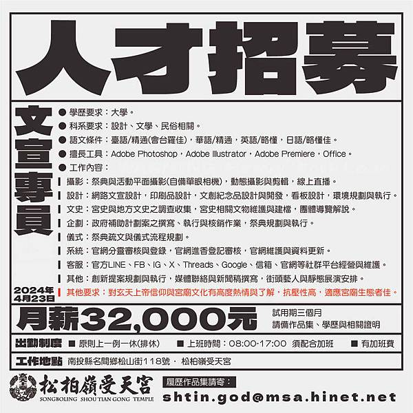 廟宇徵人開32K -公告招募社群小編-出勤制度採1例1休,上班時間9小時,須配合加班--大學-畢業;須精通台語、華語,略懂台羅、英語、日語者佳。同時須自備單眼相機