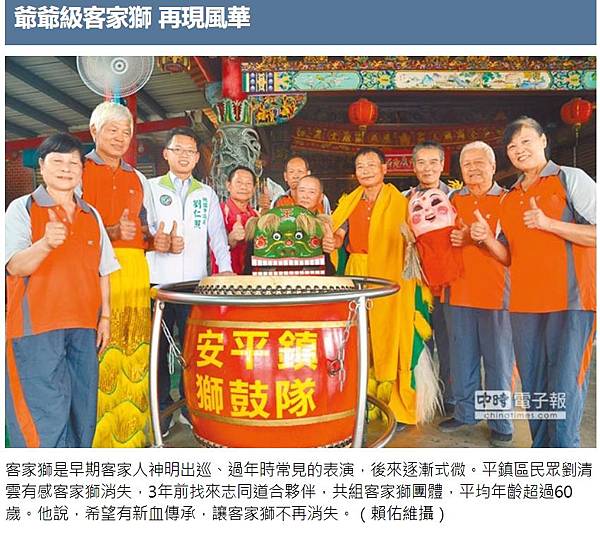 客家獅是早期客家人神明出巡、過年時常見的表演,後來逐漸式微。平鎮區民眾劉清雲有感客家獅消失,3年前找來志同道合夥伴,共組客家獅團體,平均年齡超過60歲。他說,希望有新血傳承,讓客家獅不再消失。
