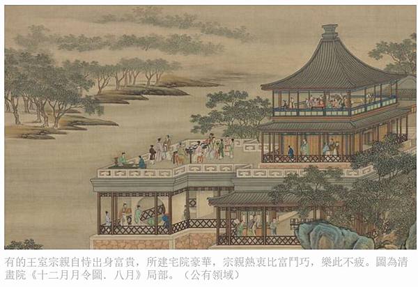 有的王室宗親自恃出身富貴,所建宅院豪華,宗親熱衷比富鬥巧,樂此不疲。圖為清 畫院《十二月月令圖.八月》局部。(公有領域)