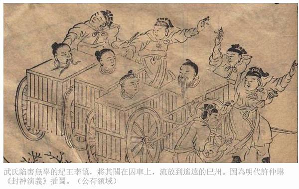 武氏陷害無辜的紀王李慎,將其關在囚車上,流放到遙遠的巴州。圖為明代許仲琳《封神演義》插圖。(公有領域)
