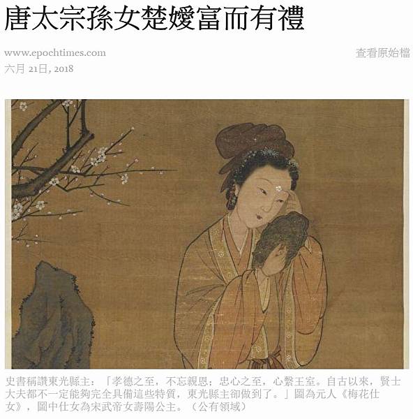 史書稱讚東光縣主:「孝德之至,不忘親恩;忠心之至,心繫王室。自古以來,賢士大夫都不一定能夠完全具備這些特質,東光縣主卻做到了。」圖為元人《梅花仕女》,圖中仕女為宋武帝女壽陽公主。(公有領域)