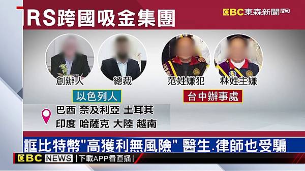 台中市調查處副主任表示,涉案的跨國吸金詐騙集團名為「IRS國際儲備體」,成立人據指是一名以色列人,數年前起陸續在巴西、土耳其、大陸等地設立辦事處,去年八月到台灣,頻頻舉辦說明會吸引投資者。