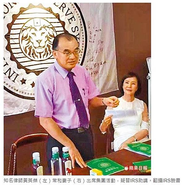 知名律師黃英傑(左)常和妻子(右)出席集團活動,疑替IRS助講。翻攝IRS臉書