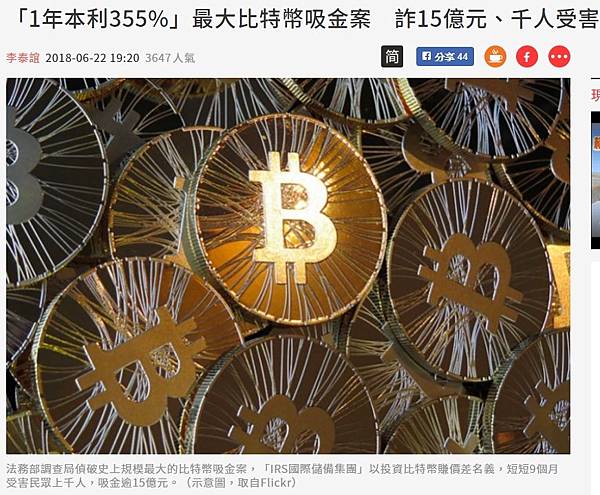 台中檢調偵破史上規模最大的比特幣吸金案,林姓男子跟范姓男子打著「IRS國際 儲備集團」名義,以販售RM(儲備金)轉投資比特幣,每日固定增值0.35%,放著 一年不提領,就能拿回355%的本利和,吸引律師、醫師等高知識份子投資,短短9個月就吸金超過15億,有上千人受害。