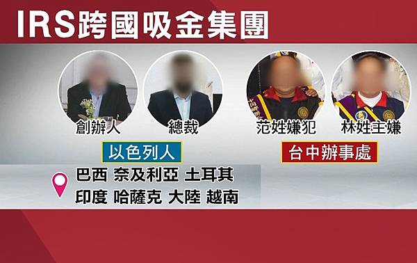 台中市調查處副主任顏志娟:「(受害)包括一些知名的律師,一些醫生啊,還有老闆級的人。」檢調指出IRS是個跨國吸金詐騙集團,成立者是一名以色列人,數年前起陸續在巴西、奈及利亞、土耳其、越南等地都設立辦事處,去年8月在台成立辦事處,林姓男子和范姓男子則是首席代表跟執行代表,透過知名律師、政商名人等,上線領導人現身說法,舉辦說明會,但今年3月後系統就被凍結,投資人錢領不到,就怕落得一場空,才向調查局檢舉。