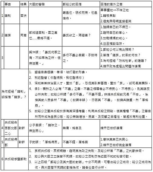 有沒有發現鄭莊公很聰明?他不是說:「軍事重地,我自己要,不給!」而是說「風水差,對弟弟不好,不方便給!」裡子面子都顧到了!鄭媽媽當然也不是省油的燈,請不到「制」就請「京」,意思是要不到湖口基地,乾脆要個台北縣,這次鄭莊公爽快答應了,讓弟弟當了「京城大叔」。這下鄭莊公的大臣們可緊張了,因為這禮給得太大,割台北縣給敵人跟割湖口給敵人,有什麼差別嗎?可是鄭莊公的回應很妙,他說: