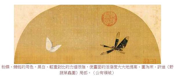 粉蝶、蜻蜓的用色,黑白、輕重對比的力道很強,使畫面的活潑度大大地提高。圖為宋.許迪《野蔬草蟲圖》局部。(公有領域)