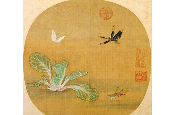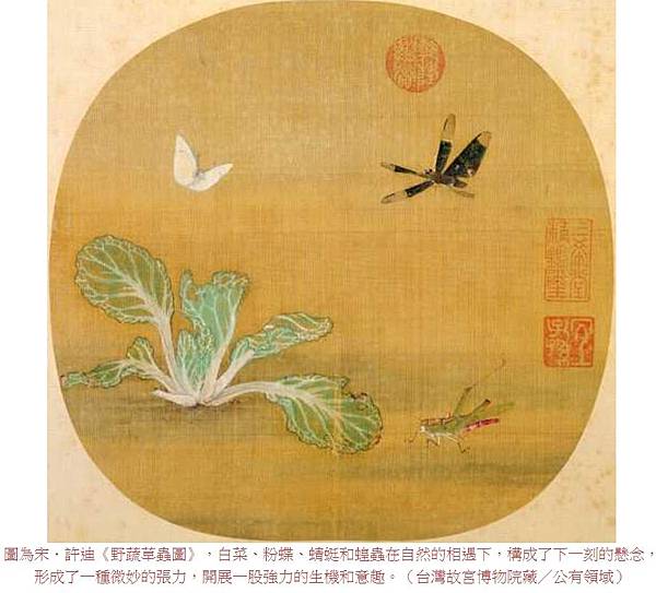 圖為宋.許迪《野蔬草蟲圖》,白菜、粉蝶、蜻蜓和蝗蟲在自然的相遇下,構成了下一刻的懸念,形成了一種微妙的張力,開展一股強力的生機和意趣。(台灣故宮博物院藏/公有領域)