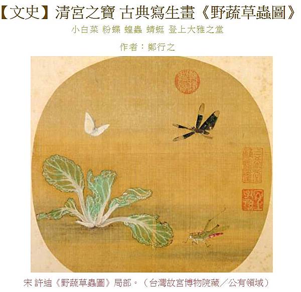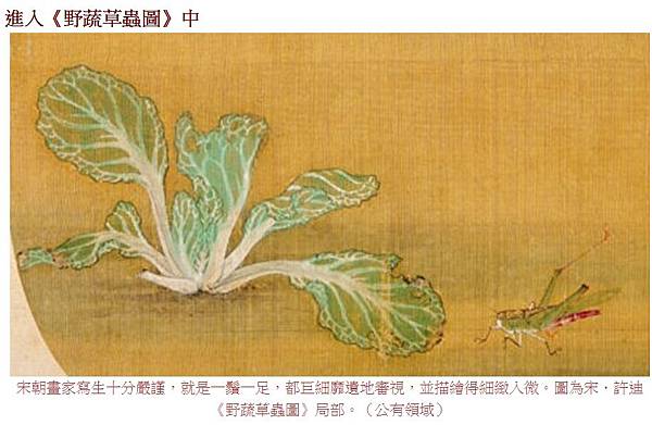 歷代以白菜為主題或以白菜入畫的作品不多,本文所介紹的《野蔬草蟲圖》就是以小白菜入畫,可謂十分難得。這畫據說是宋代畫師許迪的作品。這棵南宋畫家筆下的小白菜,比起故宮博物院著名的清代玉雕《翠玉白菜》,可是毫不遜色呢!