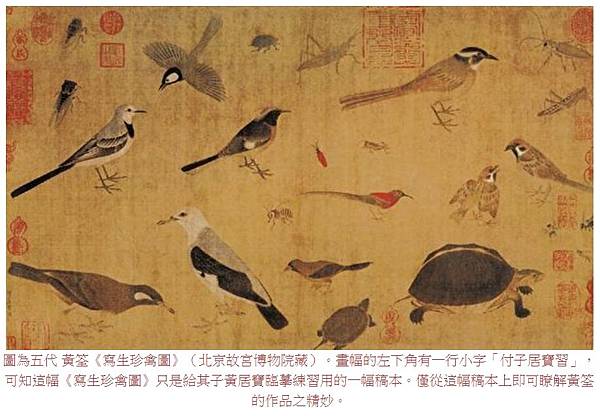 圖為五代 黃筌《寫生珍禽圖》(北京故宮博物院藏)。畫幅的左下角有一行小字「付子居寶習」,可知這幅《寫生珍禽圖》只是給其子黃居寶臨摹練習用的一幅稿本。僅從這幅稿本上即可瞭解黃筌的作品之精妙。