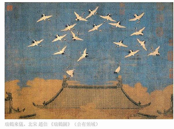 瑞鶴來儀。北宋 趙佶 《瑞鶴圖》(公有領域)