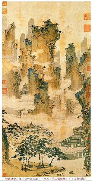 明嘉靖廿九年(公元1550年),仇英《仙山樓閣圖》。(公有領域)