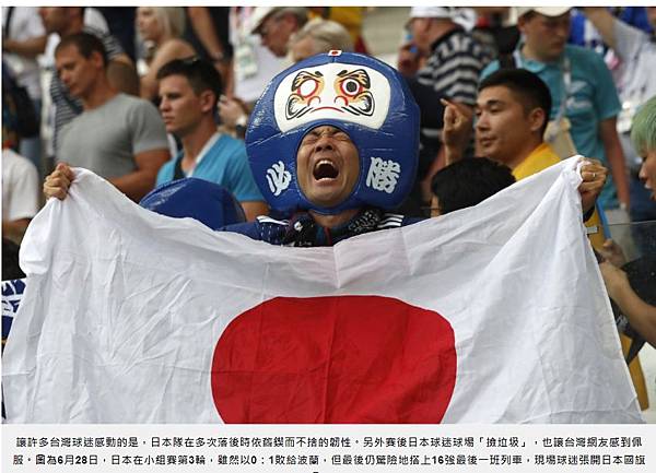 報導稱,世界杯期間日本隊的不俗表現,使得原本就有文化好感的台灣多出了很多新的日本隊球迷。曾參與台灣足球代表隊教練團運作的真田圭輔向BBC中文網表示:「我覺得現在在台灣的日本隊支持者很多,不少日本球會都有興趣開發台灣市場,近年很多日本足球人士願意來台教球與交流,都讓台灣人對日本足球有好感」。