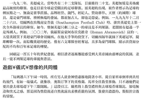 身在臺灣這個運動不被重視的環境中,你很難想像在足球的背後,可以有這麼多錯綜複雜的故事,在英格蘭,每一條高速公路、每一個地鐵站、每一個咖啡館、每一個賣肉派的小攤位,很可能都倚靠著足球而生存,在股市中,人們追捧著相關的足球類股,在大學裡,足球產業科系是修選的熱門,足球電視轉播的權利金一再出現你難以想像的天價,足球,在這個國家裡讓人瘋狂,當然,也經常讓人崩潰。
