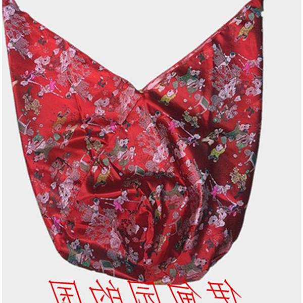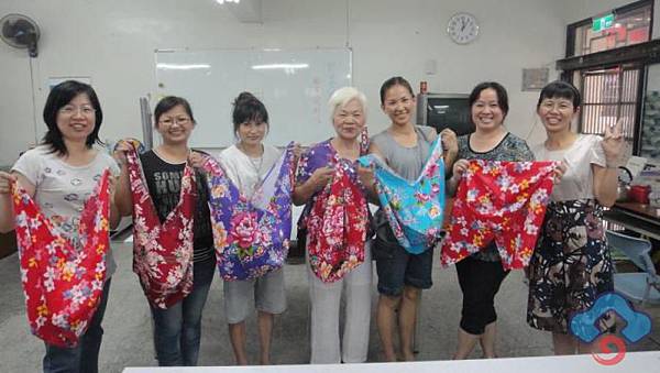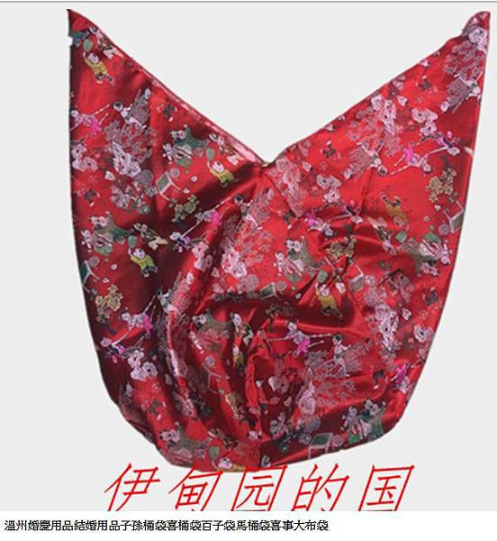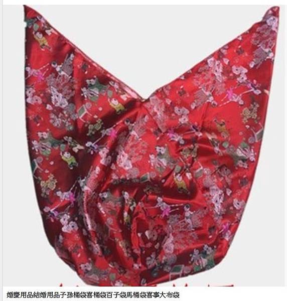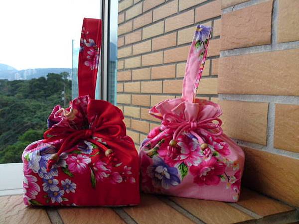 技法流派:早期結婚的傳統習俗當中,女方的陪嫁禮品裡面,都有準備三個用花布做成的袋子,這種布袋有個名稱叫「祖宗三代」(袋),其做法是:1. 取長6尺、寬3尺的布。2. 在這長(6尺)邊取中心線和中心點,中心線分四等份長度,再將這四分之一的長度,由中心點左右延伸出,再將左右兩邊由不同向,一上一下,取一與中心線平行向,成為一梯形線。3. 將此梯形線剪開,再將兩片布的花色向內,梯形位置對折,角對角車縫,成為布包的四角之一,另一片布以相同方式車縫。4. 最後,將兩片已車縫的布,角外側邊相互對齊,車縫起,布包成形,其車縫部分需滾邊(摺骨)再車一次,以加強牢固性,這樣「祖宗三代」即完成。