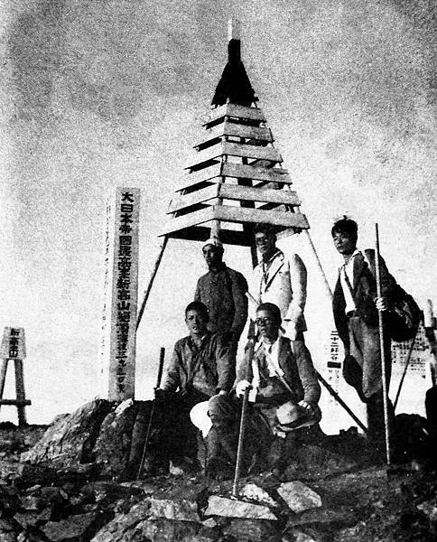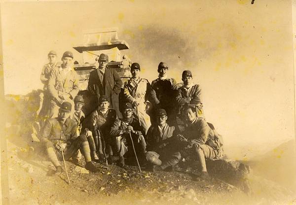 圖為大甲壯丁團員,在登上新高山(玉山)前,在新高山上全台灣(含日本)最高的,「新高神社」前合影留念。