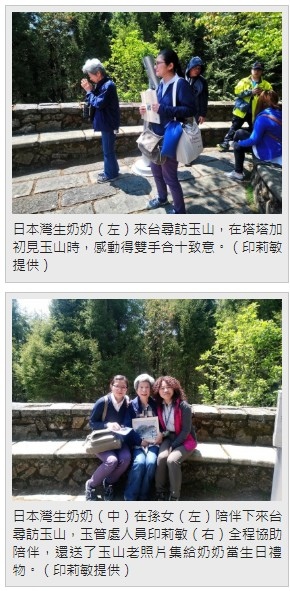 〔記者劉濱銓/南投報導〕74歲日本灣生奶奶尾崎靜代,日前在孫女陪伴下,遠從日本到玉山國家公園尋訪玉山,起初灣生奶奶在塔塔加見到玉山,就忍不住跪地大哭,之後玉管處人員帶奶奶到新中橫公路,讓奶奶飽覽玉山山脈,卻使奶奶情緒更加激動,趴在護欄旁跪地痛哭,彷彿早年被迫離台,羈絆一生的思念獲得紓解,連玉管處人員也為之動容,事後得知當天是奶奶生日,尋見玉山不僅圓了心願,也是此生難忘的生日禮物。