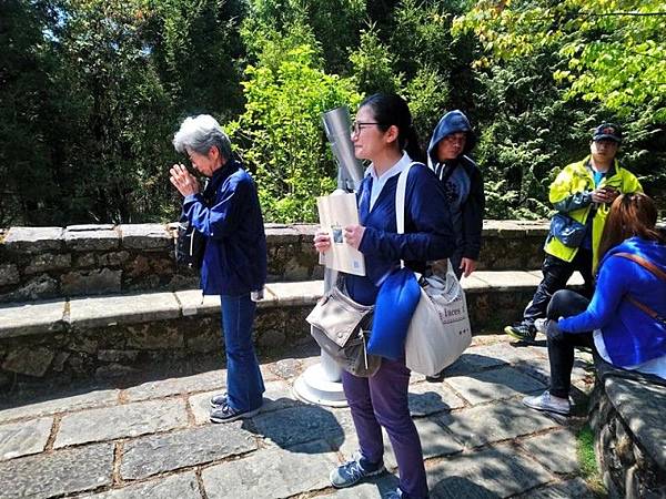 日本灣生奶奶(左)來台尋訪玉山,在塔塔加初見玉山時,感動得雙手合十致意。(印莉敏提供)