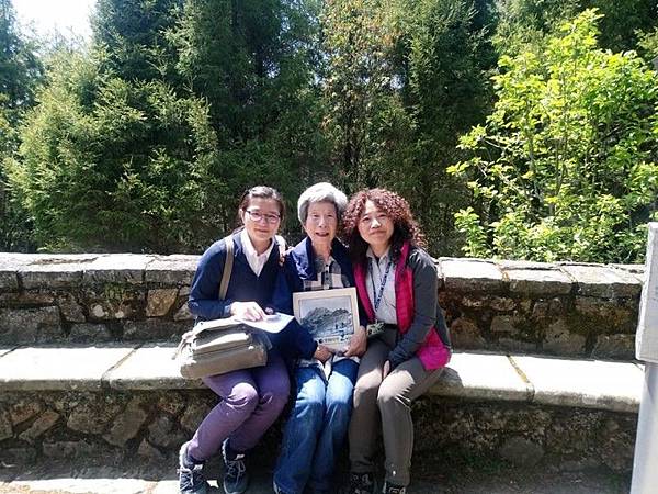 日本灣生奶奶(中)在孫女(左)陪伴下來台尋訪玉山,玉管處人員印莉敏(右)全程協助陪伴,還送了玉山老照片集給奶奶當生日禮物。(印莉敏提供)