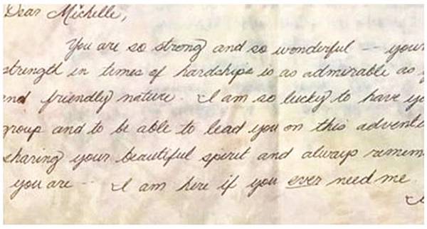 You are so strong and so wonderful — your courage in strength in times of hardships is as admirable as your optimism and friendly nature.I am so lucky to have you in my group and to be able to lead you on this adventure. Never stop sharing your beautiful spirit and always remember how special you are. I am here if you ever need me.