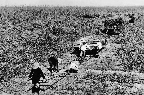 日治時期蔗田運蔗舖陳輕便軌道舊照 --軌道輕便二人可舉起方便,可邊酨行邊鋪軌