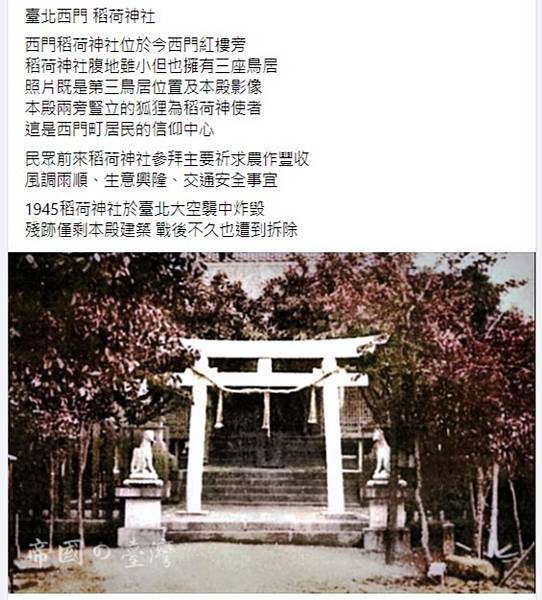 臺北稻荷神社位於臺北西門市場八角樓(今西門紅樓)旁,現已不存。照片中可看到三組鳥居。