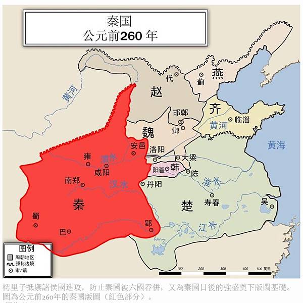 樗里子抵禦諸侯國進攻,防止秦國被六國吞併,又為秦國日後的強盛奠下版圖基礎。圖為公元前260年的秦國版圖(紅色部分)。