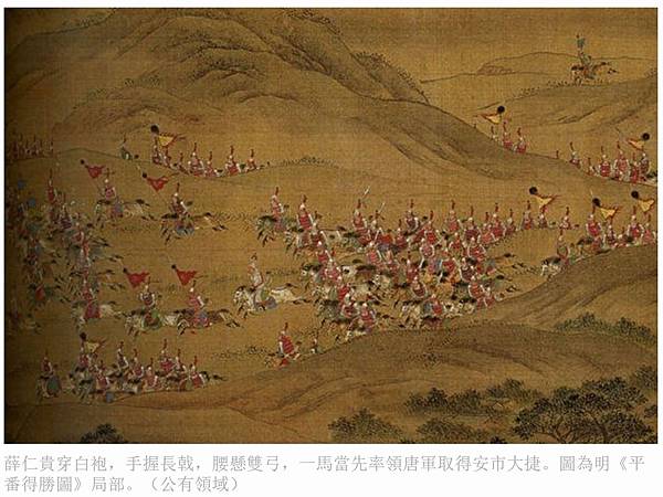 薛仁貴穿白袍,手握長戟,腰懸雙弓,一馬當先率領唐軍取得安市大捷。圖為明《平番得勝圖》局部。(公有領域)