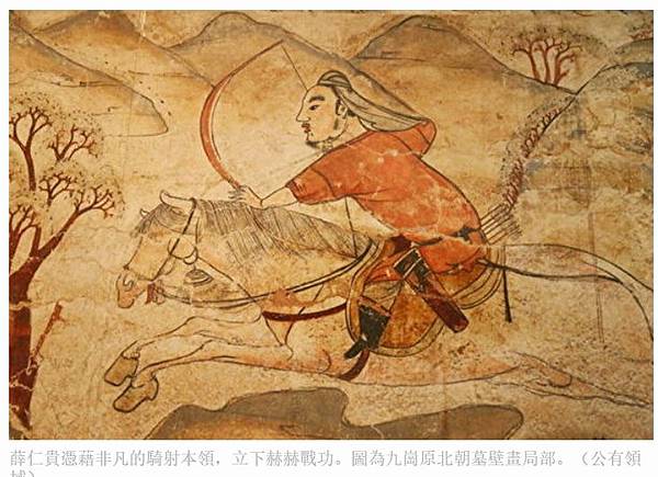 薛仁貴憑藉非凡的騎射本領,立下赫赫戰功。圖為九崗原北朝墓壁畫局部。(公有領域)