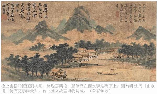 徐上舍搭船渡江到杭州,路過嘉興後,船停靠在西水驛站碼頭上。圖為明 沈周《山水冊.仿高克恭雨景》,台北國立故宮博物院藏。(公有領域)