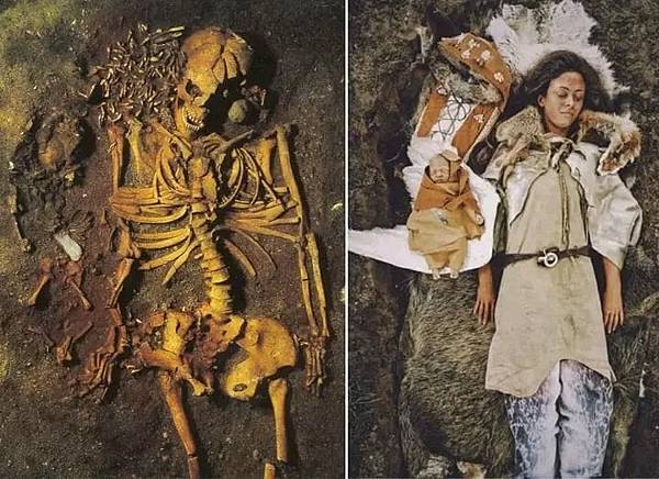 一個 7000-6000 年前埋葬的年輕女子(去世時年齡在 20 歲左右)和她剛出生的嬰兒。這座墳墓位於丹麥韋德貝克,講述了一個年輕女子和她剛出生的嬰兒的悲慘但好奇的故事。據信,這名女子死亡時年僅20歲,據信她是在孩子出生時去世的,但孩子沒能活下來。這個墓葬之所以特別耐人尋味,是因為女人的頭部放置了 200 顆馬鹿牙齒,而新生兒則被抱在天鵝翅膀上,天鵝的臀部插著一把燧石刀。動物器官的存在表明該地區的人們非常欣賞自然。它表明,當時的人們使用環境中可用的不同必需品來進行儀式或創造藝術。(4) Savagelips01 - 7000-6000 年前的年輕女子墓葬(年齡... | Facebook https://bit.ly/3YN62XO