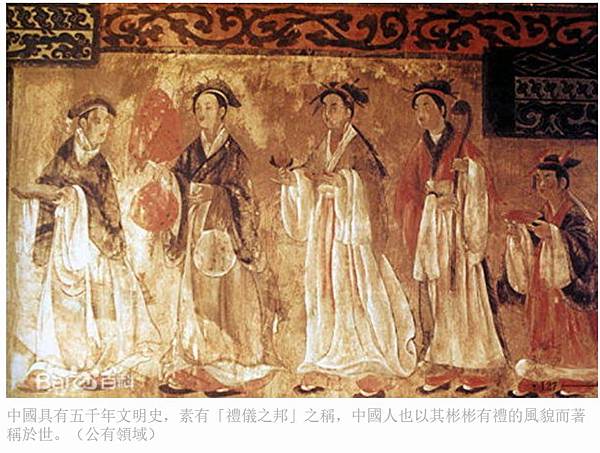 中國具有五千年文明史,素有「禮儀之邦」之稱,中國人也以其彬彬有禮的風貌而著稱於世。(公有領域)