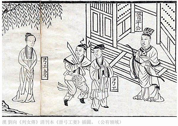 漢 劉向《列女傳》清刊本《晉弓工妻》插圖。(公有領域)