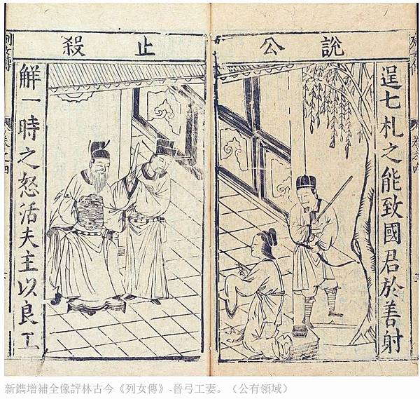新鐫增補全像評林古今《列女傳》-晉弓工妻。(公有領域)