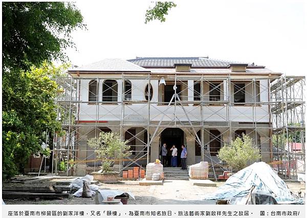 座落於臺南市柳營區的劉家洋樓,又名「頤樓」,為臺南市知名旅日、旅法藝術家劉啟祥先生之故居,預計今(2018)年底修復完成。今(18) 日代理市長李孟諺及文化局長葉澤山前往視察,並與劉啟祥先生公子、同為藝術家的劉耿一老師一同參觀並期許,未來將串連鄰近的劉家古厝、吳晉淮音樂紀念館,成為具有藝術特色的文化路線,帶動柳營地方發展。