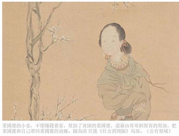 董國慶的小妾,不僅賺錢養家,幫助了貧困的董國慶,還藉由哥哥虯髯客的幫助,把董國慶和自己帶回董國慶的故鄉。圖為清 任熊《仕女消閒圖》局部。(公有領域)