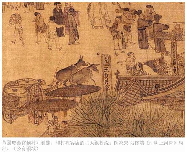 董國慶棄官到村裡避難,和村裡客店的主人很投緣。圖為宋 張擇端《清明上河圖》局部。(公有領域)