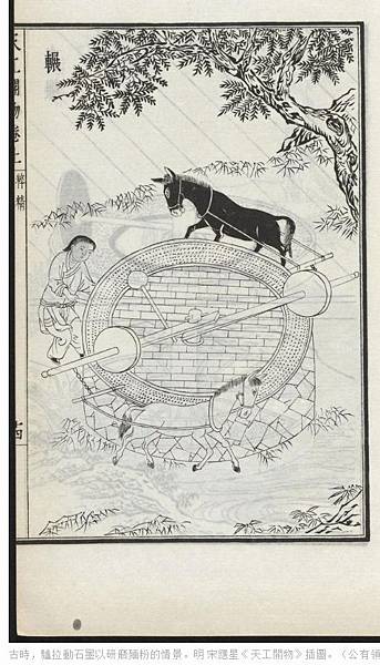 古時,驢拉動石墨以研磨麵粉的情景。明 宋應星《天工開物》插圖。(公有領域)