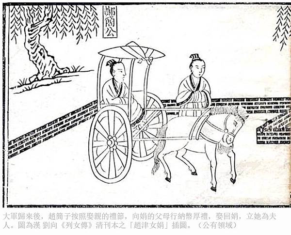 大軍歸來後,趙簡子按照娶親的禮節,向娟的父母行納幣厚禮,娶回娟,立她為夫人。圖為漢 劉向《列女傳》清刊本之「趙津女娟」插圖。(公有領域)