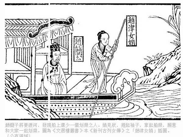 趙簡子將要渡河,發現船上還少一個划槳之人。娟見狀,捲起袖子,拿起船槳,願意和大家一起划槳。圖為《文選樓叢書》本《新刊古列女傳》之「趙津女娟」插圖。(公有領域)